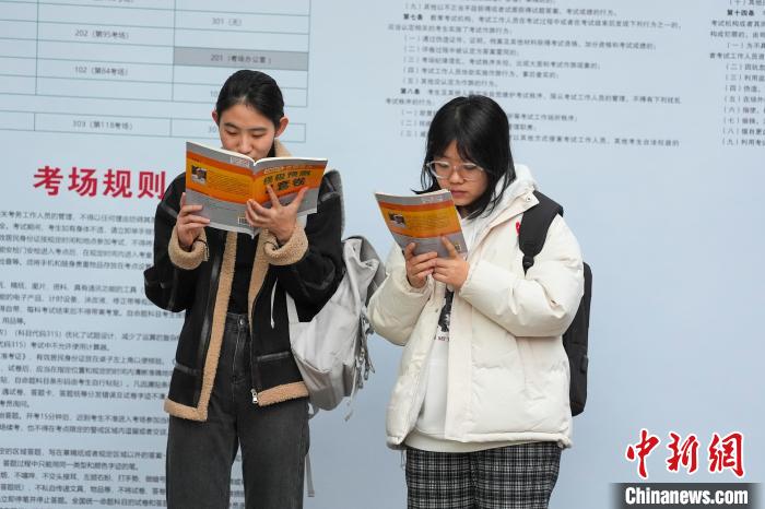 圖為考生在考場外復習。中新社記者 楊華峰 攝