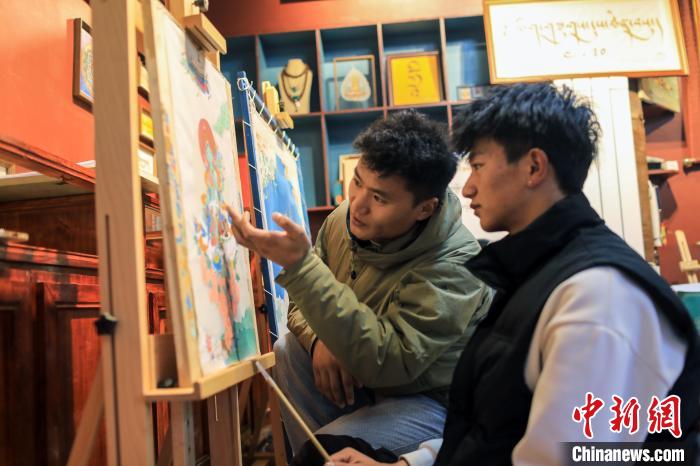 四川省甘孜藏族自治州理塘縣勒通古鎮(zhèn),是一個融合了特色傳統(tǒng)文化和現(xiàn)代創(chuàng)新的重要旅游目的地。近年來,理塘縣強化地域特色文化的保護,并引導(dǎo)當?shù)鼐用翊蛟炝艘幌盗刑厣幕糜涡马椖?。唐卡、皮具工藝、藏文書法及土陶制作等傳統(tǒng)工藝項目不僅得到了保護,還吸引了大量游客前來觀賞和交流。圖為12月22日,在勒通古鎮(zhèn)的“唐卡館”,畫師昂旺登登(左)指導(dǎo)洛絨曲扎繪制唐卡。中新社記者 王磊 攝