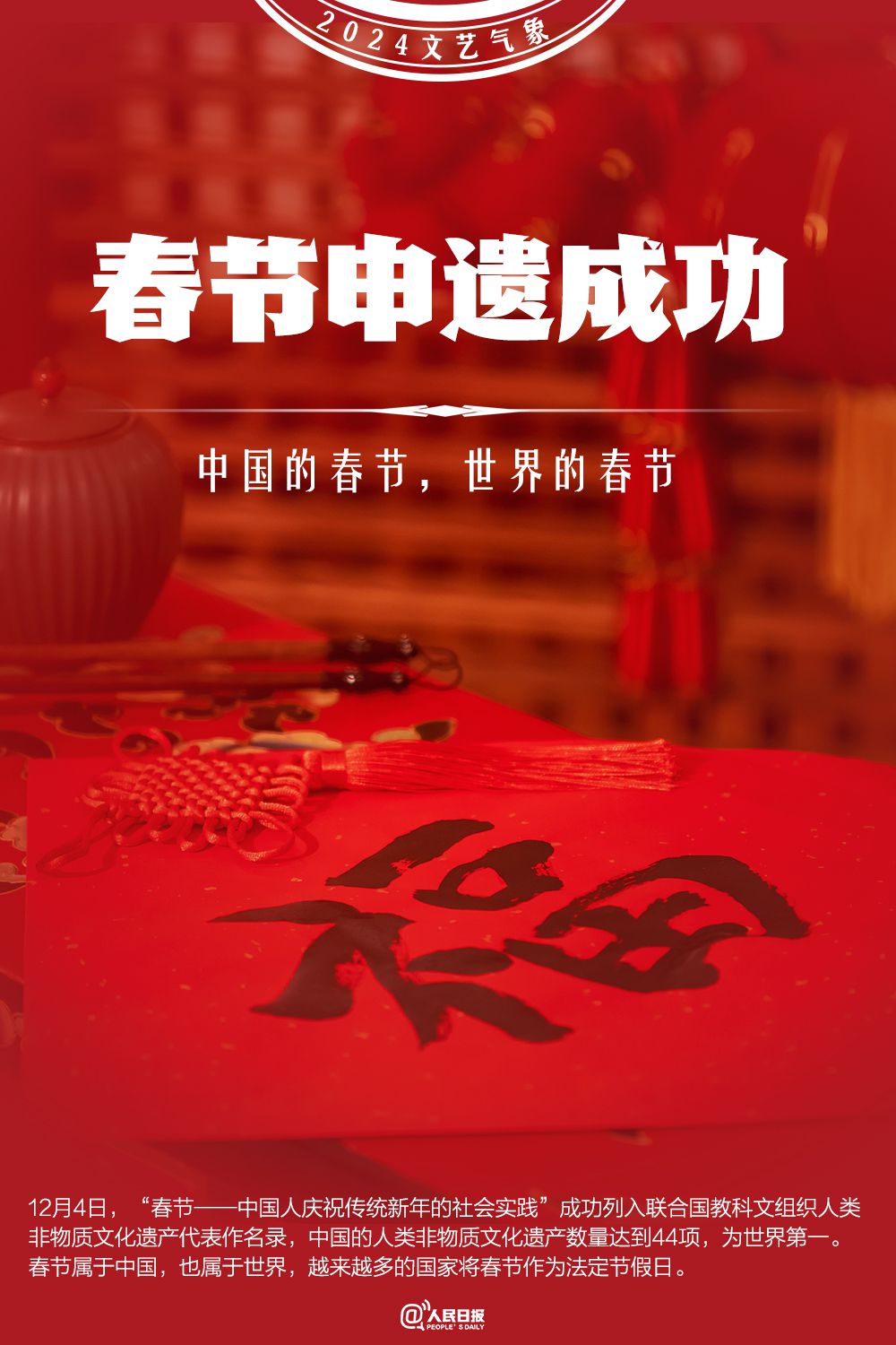 2024年7月27日,“北京中軸線——中國(guó)理想都城秩序的杰作”成功列入《世界遺產(chǎn)名錄》,中國(guó)世界遺產(chǎn)總數(shù)達(dá)到59項(xiàng)。12月4日,“春節(jié)——中國(guó)人慶祝傳統(tǒng)新年的社會(huì)實(shí)踐”成功列入聯(lián)合國(guó)教科文組織人類非物質(zhì)文化遺產(chǎn)代表作名錄,至此,中國(guó)共有44個(gè)項(xiàng)目列入聯(lián)合國(guó)教科文組織非物質(zhì)文化遺產(chǎn)名錄、名冊(cè),總數(shù)居世界第一。