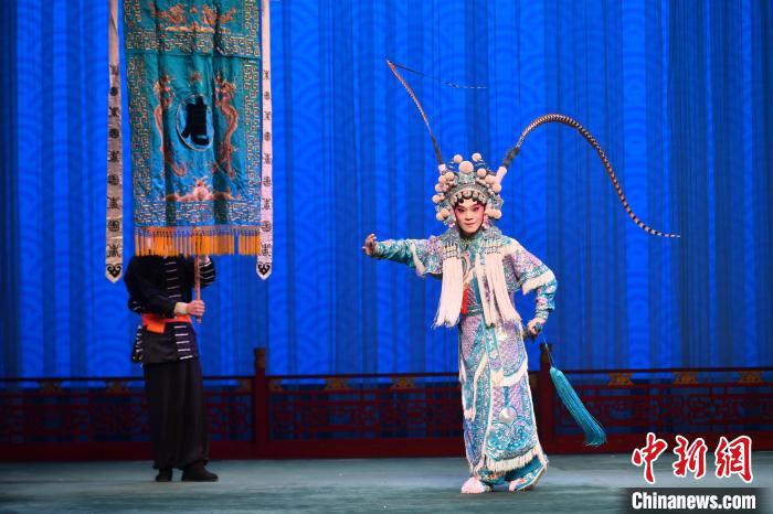 30日晚,“閩臺共譜梨園曲·不負韶華正青春”兩岸傳統(tǒng)文化交流系列活動在福州鳳凰劇院舉辦。圖為臺灣青年演員楊瑞宇在京劇《扈家莊》里飾演扈三娘。中新網(wǎng)記者 呂明 攝