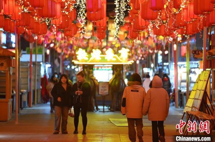 1月13日晚,甘肅敦煌夜市內(nèi),游人感受新春燈飾。據(jù)了解,從2024年12月1日至2025年2月28日,當(dāng)?shù)伉Q沙山月牙泉、玉門關(guān)、敦煌雅丹世界地質(zhì)公園等景區(qū)對國內(nèi)外所有游客免門票,莫高窟門票實(shí)行半價(jià)優(yōu)惠,開放洞窟由8個(gè)增加至10個(gè),為游客提供了更為豐富的觀賞內(nèi)容。中新社記者 李亞龍 攝