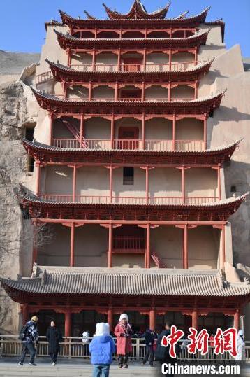 1月13日,甘肅敦煌莫高窟景區(qū)內(nèi),游人在莫高窟標(biāo)志性建筑九層樓前拍照打卡。據(jù)了解,從2024年12月1日至2025年2月28日,當(dāng)?shù)伉Q沙山月牙泉、玉門關(guān)、敦煌雅丹世界地質(zhì)公園等景區(qū)對國內(nèi)外所有游客免門票,莫高窟門票實(shí)行半價(jià)優(yōu)惠,開放洞窟由8個(gè)增加至10個(gè),為游客提供了更為豐富的觀賞內(nèi)容。中新社記者 李亞龍 攝