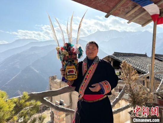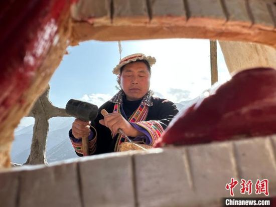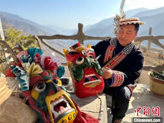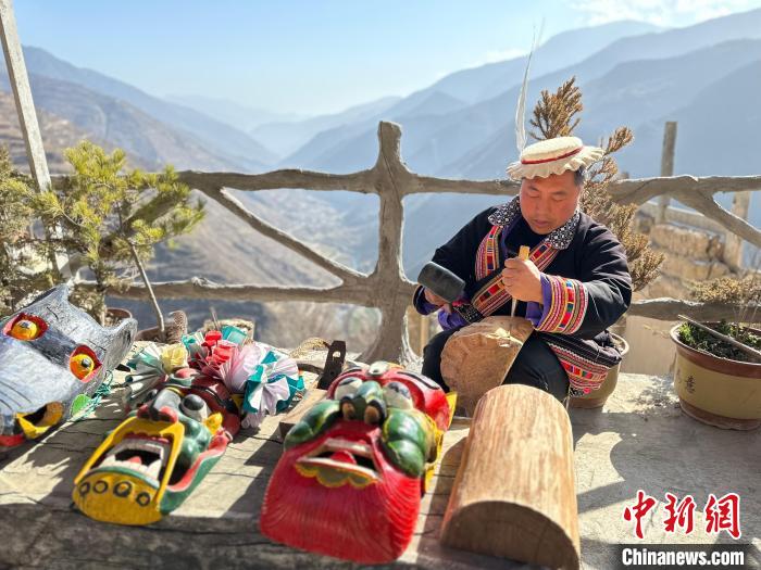 雕刻、打磨、上色……甘肅隴南市文縣鐵樓藏族鄉(xiāng)強(qiáng)曲村,白馬人薛剛一家四代人都精于木工。日前中新網(wǎng)記者走訪村子時(shí),薛剛坐在自家院子里,伏案制作池哥晝所用面具。池哥晝是白馬人保留最完整、最具特色民族舞蹈,面具是重要道具之一。薛剛制作的面具不僅用于周邊村子的池哥晝中,而且被廣州、上海等地的客商購(gòu)買(mǎi)收藏。他時(shí)常將自己的想象融入面具中,用心打磨使其更具“靈氣”。他說(shuō),白馬人中從事面具雕刻的手藝人不多,最近他物色了一個(gè)“00后”徒弟,對(duì)方興趣濃厚,希望將這門(mén)手藝保護(hù)傳承好。圖為薛剛在院子里雕刻面具。閆姣 攝
