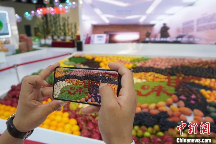 2022年7月10日,第二十八屆中國蘭州投資貿(mào)易洽談會展區(qū)展示甘肅地方特色產(chǎn)品。圖為參觀者手機(jī)拍攝用農(nóng)產(chǎn)品拼裝的“甘味”。(資料圖)九美旦增 攝
