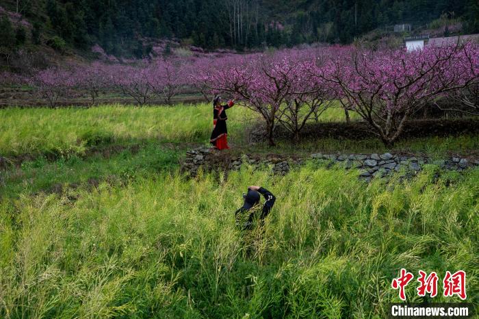 時下正是桃花盛開的時節(jié),在廣西田林縣浪平鎮(zhèn)浪平村,村民種植的桃花競相綻放。滿樹繁花與錯落村舍相互映襯,還有樹旁玩耍的孩童、樹下勞作的村民,動靜交織,構(gòu)成一幅絕美的田園春景圖。圖為3月15日,在廣西田林縣浪平鎮(zhèn)浪平村,村民在桃樹下勞作。黃數(shù)情 攝