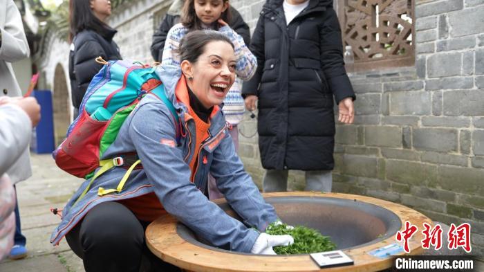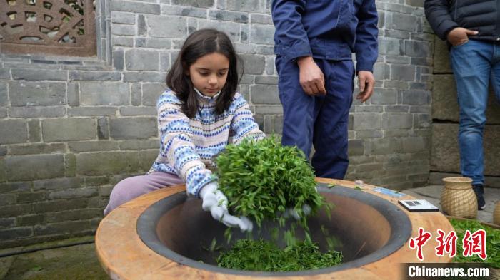 3月30日,來(lái)自巴西的游客奧莉薇體驗(yàn)炒茶?!≈旌I?nbsp;攝