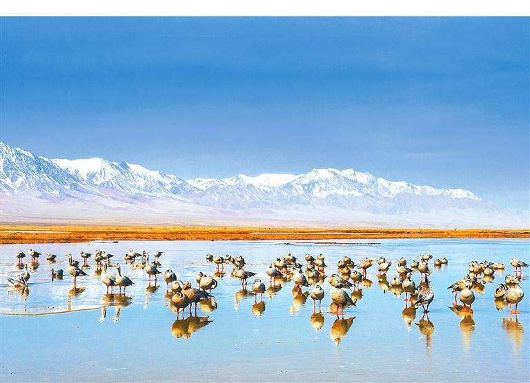 當(dāng)祁連山的雪線以肉眼難以察覺的速度后退時,鹽池灣的冰封鏡面開始出現(xiàn)裂紋。最先感知到這一變化的不是融水沖刷出的溝壑,而是斑頭雁黃色的喙。它們在三月底的晨昏線上劃過,雙翅呼呼生風(fēng)。冰凌碎屑尚未與雁羽摩擦,便已發(fā)出細(xì)密的簌響,像是古琴開弦前的調(diào)音。野馬南山與黨河南山兩山之間形成的盆地內(nèi)河流縱橫、湖泊密布,草甸、沼澤交錯,是斑頭雁和其他水鳥世代棲息繁衍的場所。盡管先頭部隊在3月下旬就已抵達(dá)這里,主力部隊卻要到4月上旬才會姍姍來遲。此時斑頭雁幼體已在越冬地充分發(fā)育,羽衣上幾乎看不到如苔蘚般斑駁生長的新羽,只是頭部的兩條黑帶不如父母深邃,這是它們少經(jīng)風(fēng)霜的證明。它們降落在濕地灘涂時,雝雝鳴雁,那聲音或許與兩千年前蘇武牧羊時在北海之畔聽到的有些許相似。