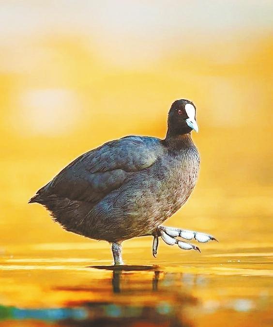 白骨頂又被喚作骨頂雞,卻是鶴類的遠(yuǎn)親。它靜浮水面時,額前一抹象牙白,宛若遺落人間的墨玉鎮(zhèn)紙。這枚額甲實為特化的角質(zhì)層,是為了保護(hù)頭部的盔胄?;野咨陌牾肴缪┑匮グ惆洪g,劃開水藻時泛起粼粼波光——這身黑羽配雪蹼的穿搭,竟比時裝周的極簡主義更先鋒。當(dāng)它們列隊掠過蘆葦蕩,水淼勾勒的剪影里,仿佛在繪制著秋天的信箋。
