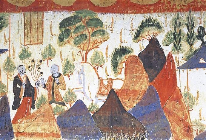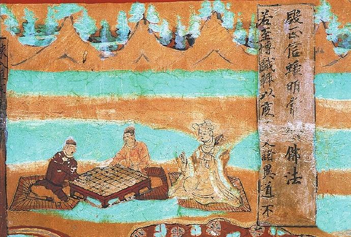 在敦煌壁畫(huà)中有關(guān)對(duì)弈的內(nèi)容較多。在莫高窟第454窟、第7窟壁畫(huà)中都有“弈棋圖”。兩幅圖的畫(huà)面有不少類似的地方:一是畫(huà)師較為突出棋盤(pán)的位置,兩幅壁畫(huà)中的棋盤(pán)都居中且形制相對(duì)巨大;二是畫(huà)面上的人物均為三人,兩人對(duì)弈,一人觀戰(zhàn),“觀棋不語(yǔ)真君子”;三是對(duì)弈者身后的景色都是天朗氣清、遠(yuǎn)山含黛。據(jù)說(shuō),一天,北宋大文豪蘇東坡與摯友黃庭堅(jiān)正在松樹(shù)底下弈棋。一陣風(fēng)吹來(lái),松果掉進(jìn)棋盤(pán)。蘇東坡隨即吟道:“松下圍棋,松子每隨棋子落。”黃庭堅(jiān)馬上回答道:“柳邊垂釣,柳絲常伴釣絲懸。”雅趣十足。其實(shí),棋局里的一動(dòng)一靜、一招一式無(wú)不需要謹(jǐn)小慎微、穩(wěn)扎穩(wěn)打。而對(duì)弈時(shí)的當(dāng)斷則斷、示假隱真、有效合作等戰(zhàn)術(shù)不僅是對(duì)弈的智慧,也是人生的哲理吧。
