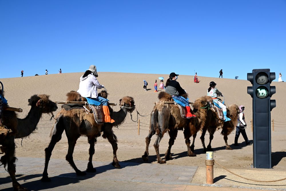 5月24日,敦煌市鳴沙山月牙泉景區(qū)的交通信號燈“綠駱駝燈”亮起時,農戶牽著駱駝有序通過。敦煌市鳴沙山月牙泉景區(qū)設置具有駱駝元素的交通信號燈,保障了景區(qū)交通安全順暢。新華社發(fā)(張曉亮攝)