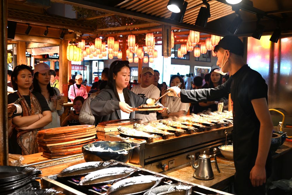 5月24日晚,游客在敦煌夜市沙州食驛選購美食。新華社發(fā)(張曉亮攝)