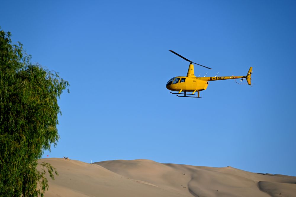 5月24日,在敦煌市鳴沙山月牙泉景區(qū),游客乘坐直升機從空中欣賞大漠風光。新華社發(fā)(張曉亮攝)
