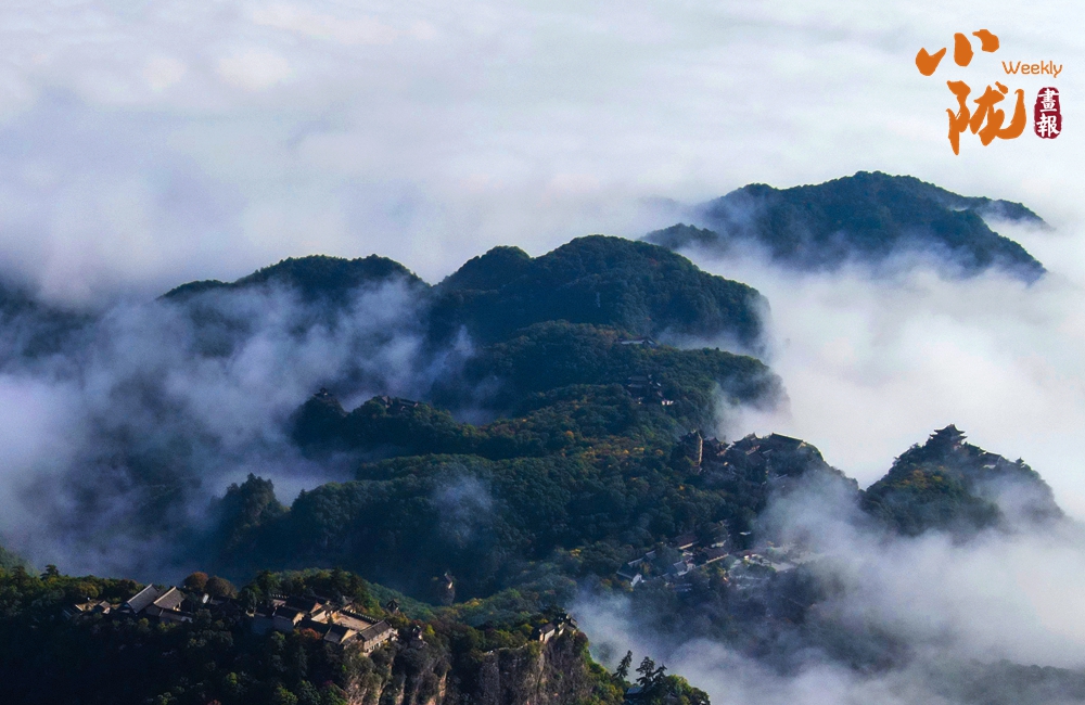 雨后初霽,云霧自幽谷翻涌升騰,如浪濤席卷峰巒,遠處山影在云濤中若隱若現(xiàn),恍若蓬萊仙島。霧氣氤氳間,林海、亭閣若隱若現(xiàn),恰似一幅流動的水墨丹青。