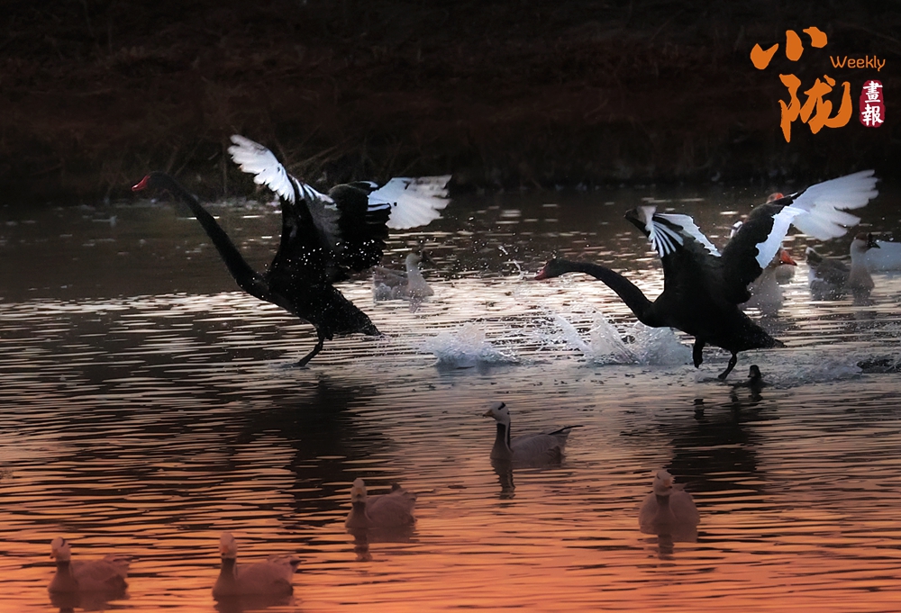 水面平靜如鏡,野生黑天鵝舒展雙翼,揚著頸脖,在水中游弋劃波,時而低頭覓食,時而相互依偎,成雙成對上演冬日浪漫。