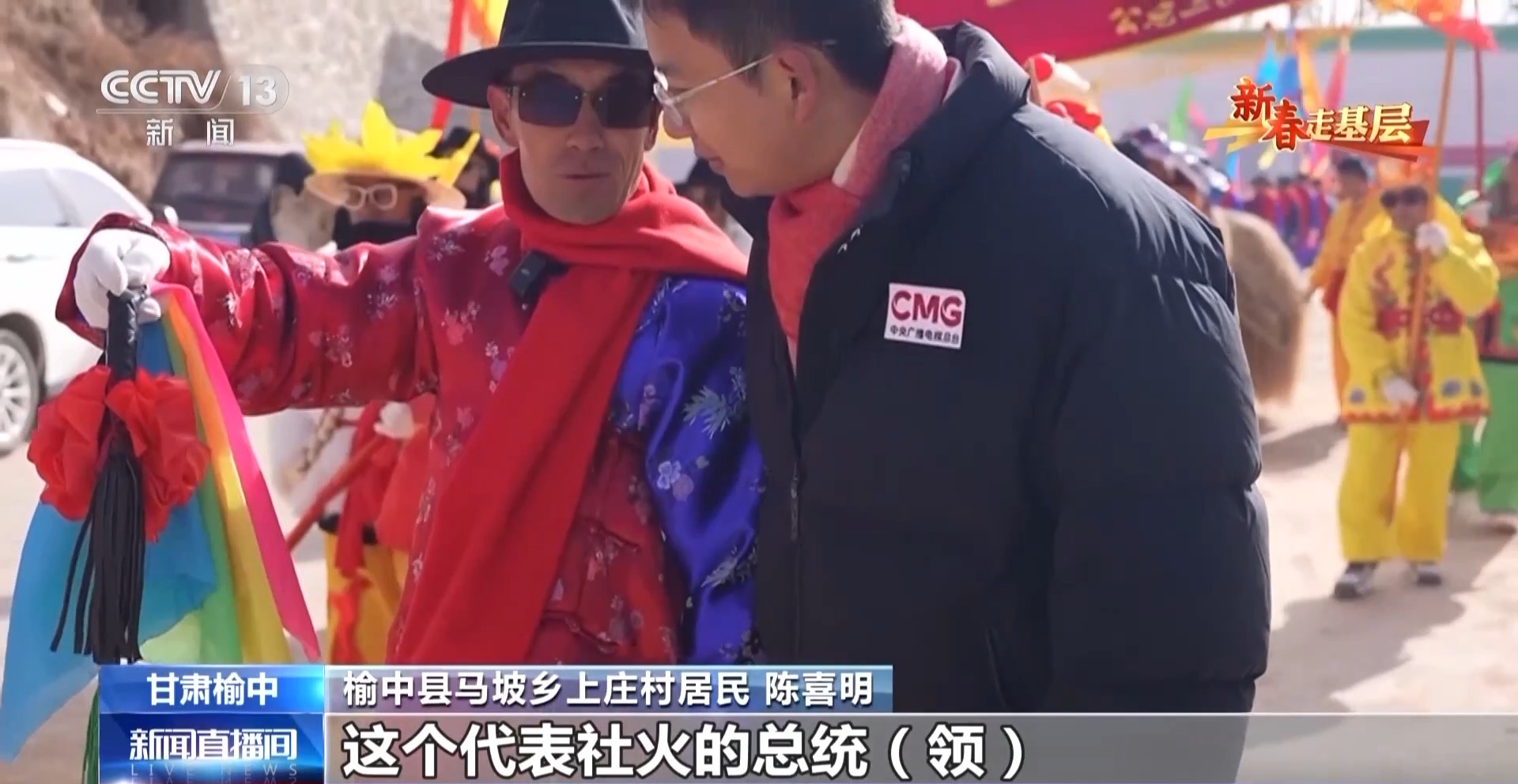 榆中縣馬坡鄉(xiāng)上莊村居民 陳喜明:這個代表社火的總統(tǒng)領,是給我們引場子的,社火就是把大家召集到一起,前段時間這里遭災,搞個社火把大家的精神提一提。