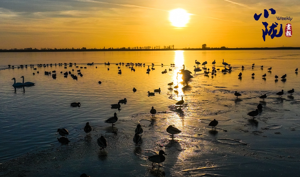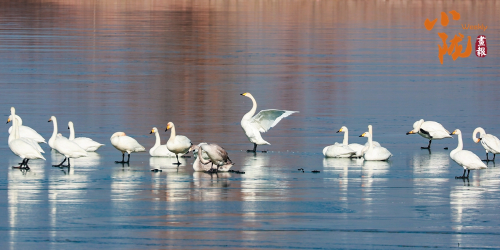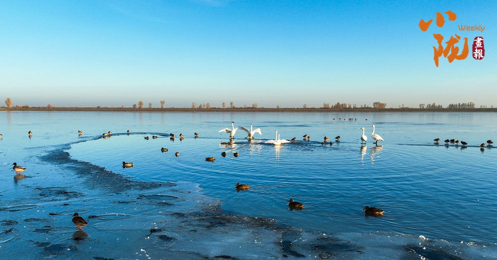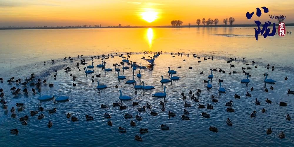 陽(yáng)光斜照,萬物生暖。水面上,成群的白天鵝不緊不慢地游著,雪白的身影倒映水中,隨著微波輕輕蕩漾,像是一幅流動(dòng)的水墨畫,素雅而安寧。